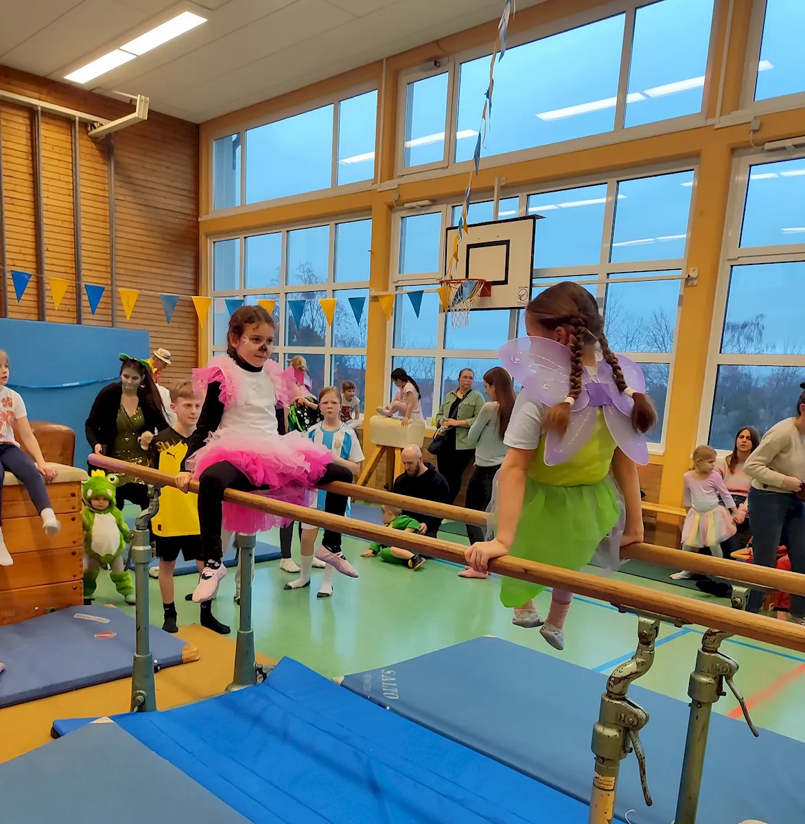 Wie immer war die Halle nach dem Einlass um 15:11 Uhr schnell mit vielen gutgelaunten Kindern gefüllt und auch viele Eltern und Großeltern wollten dem Geschehen zusehen oder mitfeiern. Alle Kinder und viele Erwachsene waren verkleidet und so gab es ein buntes Bild. Viele kommen immer wieder, aber auch einige neue Gesichter waren dabei!