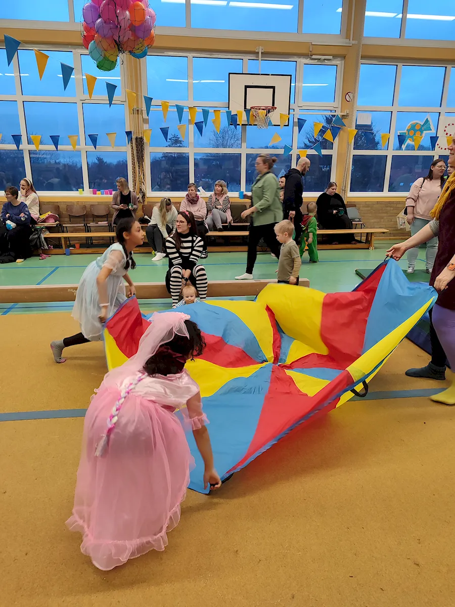 Zwischendurch toben die Kinder durch die Halle, tanzen nach der Musik und turnen an den aufgestellten Sportgeräten.